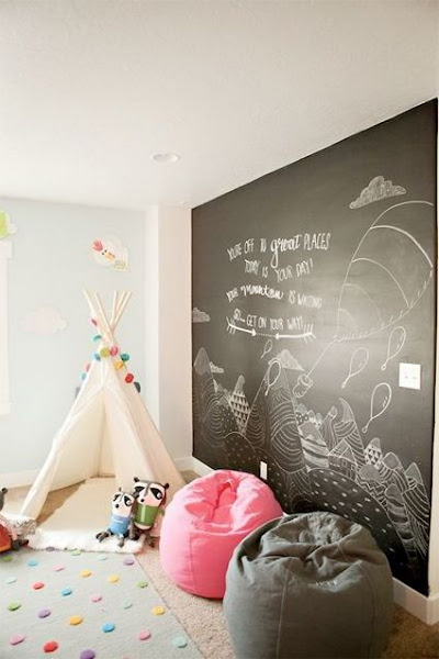Una solución decorativa que funciona muy bien es pintar la zona donde se ubica el espacio de juego de un tono distinto al resto de paredes de la habitación, dentro de la misma gama cromática. También podemos pintar una de las paredes con pintura de pizarra para que puedan desarrollar su creatividad.