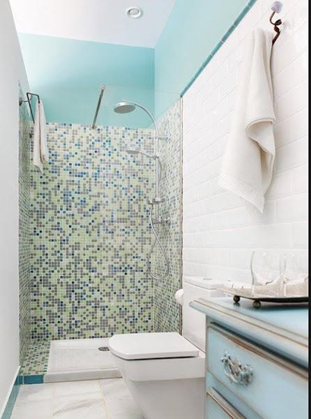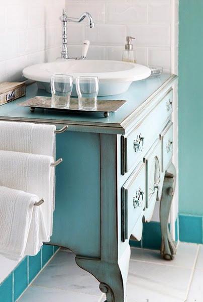 Otra opción para recuperar muebles de esos heredados que no sabemos donde poner pero tampoco queremos, ni debemos, tirar,darles un nuevo uso. En este caso convertimos una cómoda de aire muy clásico en un mueble de baño ideal de la muerte. Lo que han hecho para adaptarlo a este baño tan moderno ha sido únicamente pintarlo de color azul a juego con las paredes y las baldosas de mosaico de la ducha. El resultado? Maravilloso!!!!
