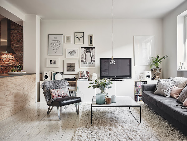 En este piso hay un montón de cosas dignas de destacar: La pared de obra vista de la cocina de concepto abierto que ayuda a separar el espacio, la mezcla de blancos y negros, con téxtiles en tonos grises y madera para dar calidez a toda la casa.
