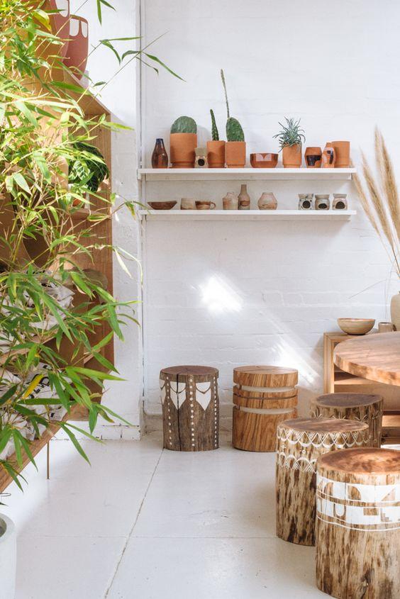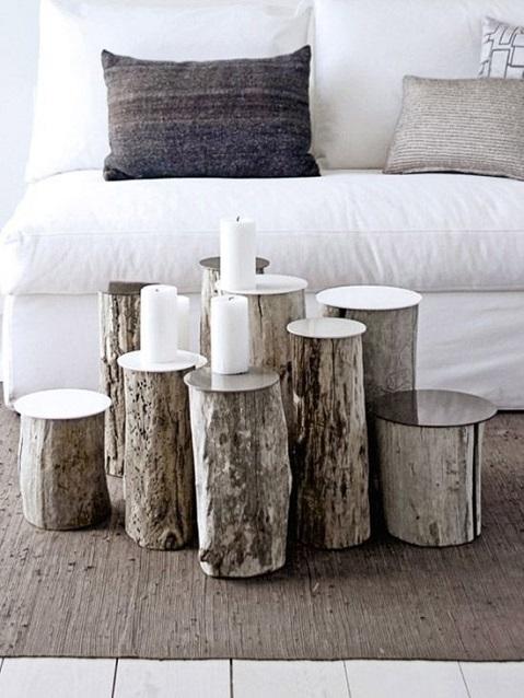 La madera se puede incluir de muchas maneras pero yo he seleccionado listones en forma de bancos, y troncos que hacen la función de mesas o taburetes. Os aseguro que estoy loca por hacerme con una bancada así.