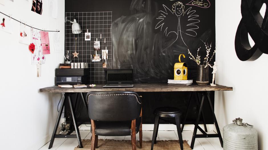 En el despacho han usado la pared donde está la mesa como pizarra. Ya sabéis que eso es muy fácil de hacer. Muchas de las marcas más conocidas de pinturas venden este tipo de pintura, y la manera de pintar es como una normal y corriente.