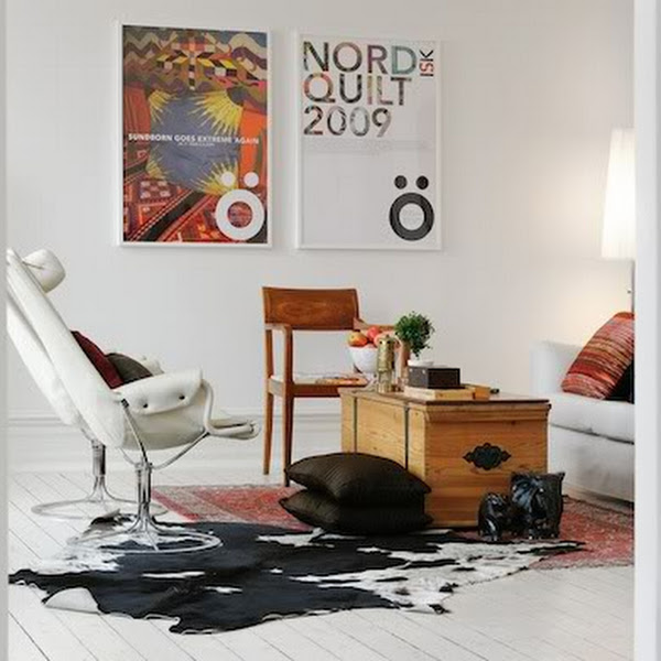 Así pues, se superpone una alfombra de piel de vaca irregular, sobre otra de planta cuadrada de dibujos muy clásicos. Una apuesta arriesgada, pero que sin duda hace mucho más especial este salón de líneas sencillas.
