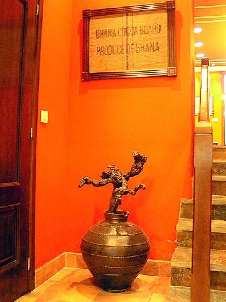 Una gran rama seca dentro de un búcaro marrón oscuro se sitúa junto a la escalera. Sus tonos y su disposición recuerdan a las colonias africanas en las que se producía cacao.
