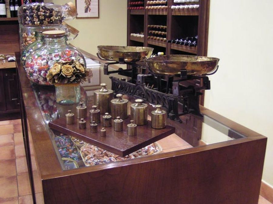 En el local se han dejado como elementos de decoración aparatos propios de las tiendas antiguas. Varias básculas para pesar cacao, además de pesas antiguas, se colocan en lugares destacados.