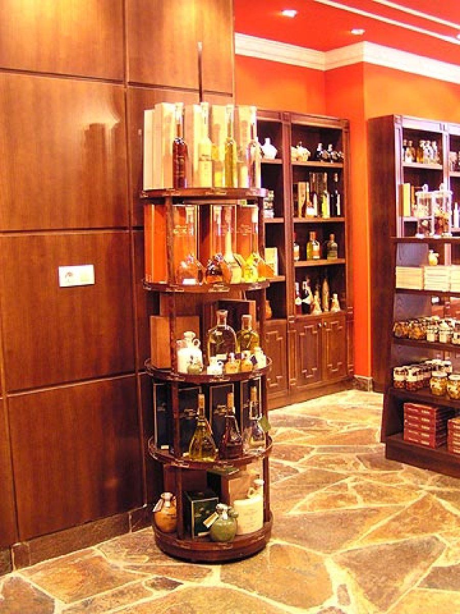 Se cuida el detalle en cada rincón. Muestra de ellos son los expositores de la mercancía. En ellos destaca el vano sobre la madera. A través de grandes cristales vemos la mercancía sobre mantelitos blancos.