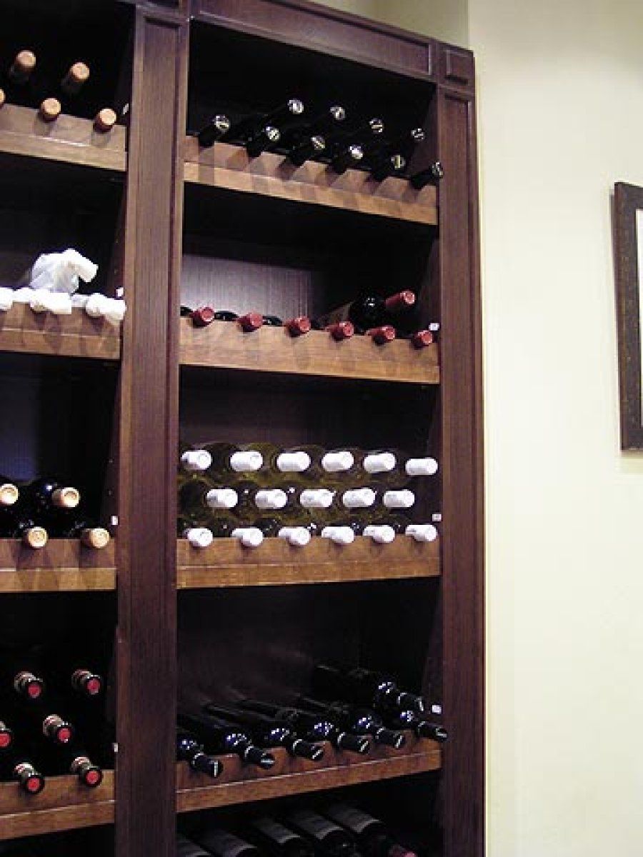 Los licores se han situado en una innovadora estantería. De forma circular y de madera oscura, permite que se muestren las botellas enteras a la perfección, así el cliente accede a las mismas fácilmente.