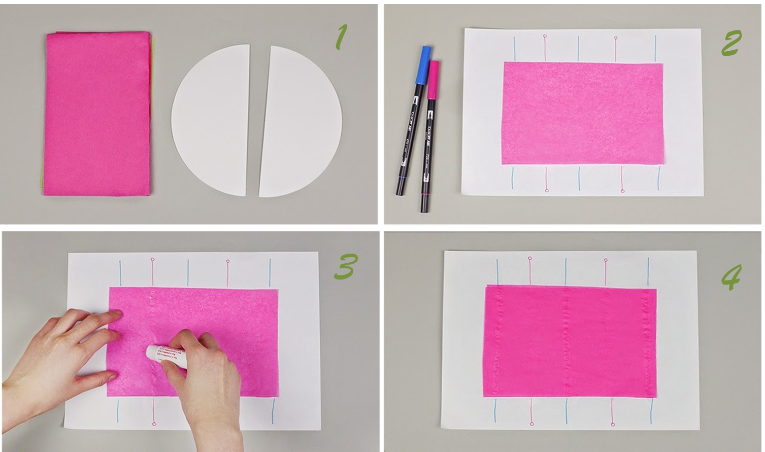 Este tutorial es un poco mas complicado que el anterior, pero si sigues las imágenes que te muestro a continuación lo conseguirás sin demasiado esfuerzo. Necesitarás pliegos de papel de seda, cartulina, pegamento de barra, tijeras y una aguja e hilo.