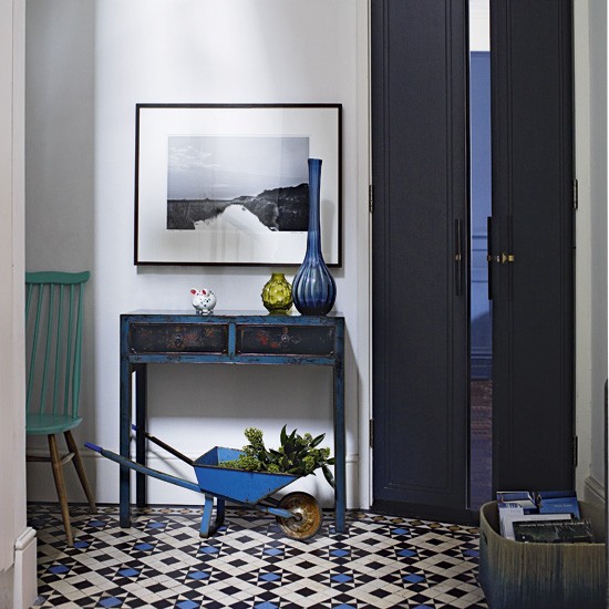 Si no te convence la opción anterior por ser demasiado arriesgada, puedes escoger un color más sobrio. Un azul marino como en este caso, crea un espacio muy especial en este recibidor.