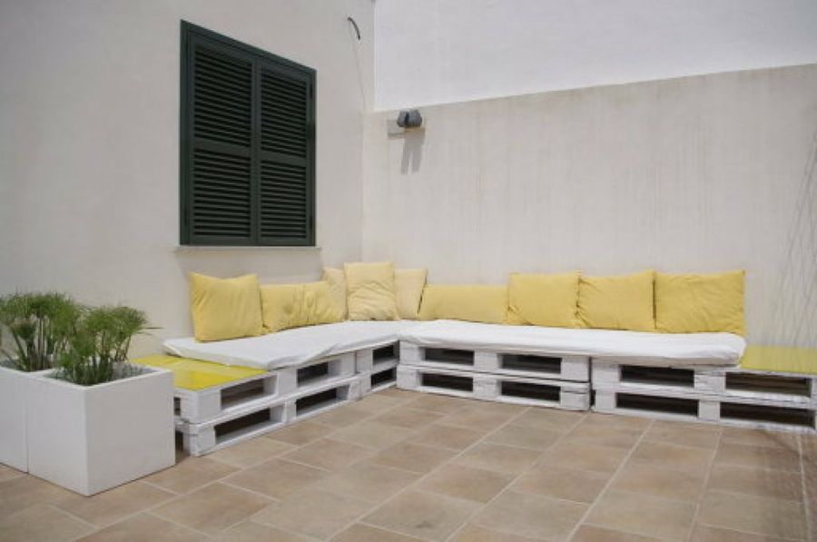 Comenzamos con el exterior de la vivienda lleno de luz, con una piscina para los más peques, un jardín... En uno de los extremos encontramos un sofá de palés hecho por ella misma donde el blanco y el amarillo funcionan a la perfección. En la zona del comedor esta decoración práctica en blanco se ha optado por una mesa de cristal y sillas Pantón.