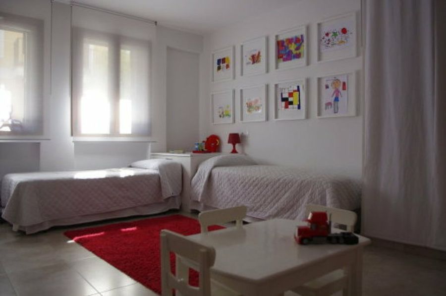 Por último la habitación infantil es un ejemplo perfecto de cómo decorar si tenemos que poner dos camas. El blanco da sensación de limpieza junto a las estanterías modulares que permiten que todo esté en perfecto orden. Nos fijamos en la decoración de las paredes donde los niños han sido protagonistas.