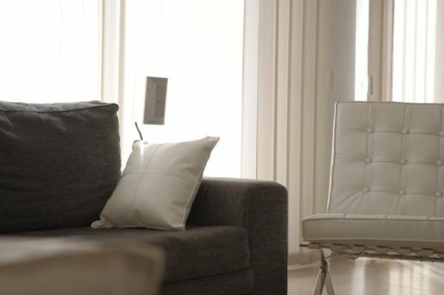 Los tonos grises y blancos se apoderan del salón, para acentuar el toque minimalista. Algunos detalles como la gran alfombra de pelo hacen que la estancia parezca más acogedora. Al igual que en el exterior se ha apostado por algos elementos clásicos del diseño como la butaca Barcelona.
