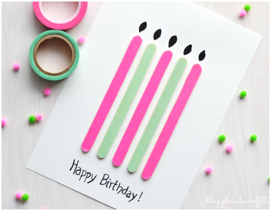 Cambiamos un poco y creamos una tarjeta de felicitación con palos de helado, cinta washitape y rotulador negro...sencillamente original y creativo. El paso a paso en Pulie de confettis