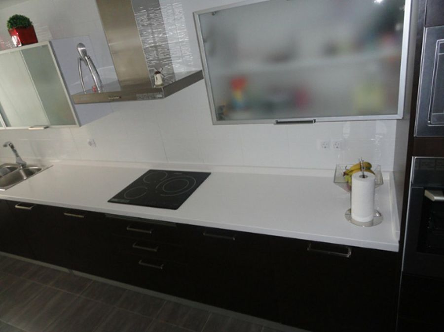 Design cuenta que en la cocina llevo a cabo algunos cambios sobre la que le ponía la constructora para ganar luz y sensación de espacio. La encimera paso a ser de Silestone blanco, lo que potencia la sensación de limpieza y los armarios de arriba son de cristal. De este modo, se da mucha ligereza al mobiliario. Nos encanta el office con toques rojos.
