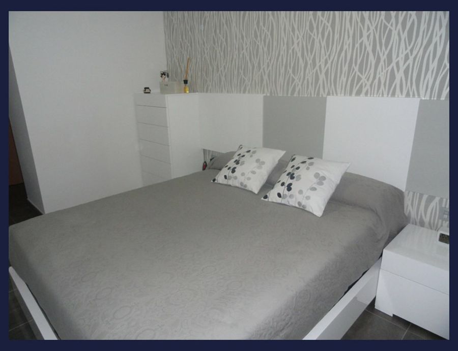 El dormitorio está dominado por el color gris, lo que crea una atmósfera relajante y perfecta para el descanso. El papel pintado de la pared del cabecero juega con este binomio cromático, al igual que la ropa de cama. A la hora de elegir el mobiliario se opto por el color blanco para poder meter más muebles que aumentarán la capacidad de almacenamiento de la estancia.
