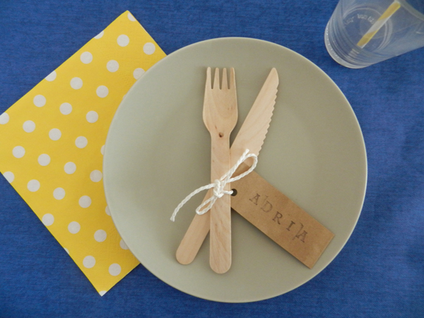 Cómo podéis ver, puse los nombres en un trocito de papel craft y junto con un cordel lo até a unos cubiertos de madera. En el vaso, para el zumo, una pajita en amarillo y blanco y, para no cambiar de color… unas servilletas también en yellow! jajaja Soy adicta… ya lo sabéis. Y por último, y para llenar un poquito la mesa, que a veces las meriendas se nos quedan escasas… Una tabla con los azucares y las cucharitas y un jarrón con eucalipto.