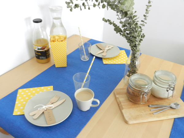 Quise usar estos caminos de mesa en azul para que todo no fuera totalmente amarillo y hacer un poco de contraste. Son de papel, aunque parecen de tel y son una pasada! Si no se ensucian los puedes guardar para volver a usar y si se ensucian, directamente a la basura. Son de la marca Paps Star, los venden en Bonpreu, Corte Inglés, etc. Y de verdad… Ahora que vienen las fechas navideñas y estamos siempre liados en la mesa, os los recomiendo 100%.