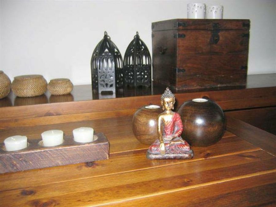 En el salón, situado en la planta baja de la propiedad, reina la intensidad cromática de la madera: "el mueble grande me lo hicieron unos expertos de aquí de Valladolid", revela Isabel, que admite que los profesionales trabajaron la pieza a medida sobre un diseño suyo.La vena artística de esta forera se materializa en las dos mesas situadas en la sala, la de centro y la del comedor. Por otro lado, los adornos que predominan en esta habitación son los justos y todos siguen una línea temática de aire místico: budas, velas, farolillos, etc.