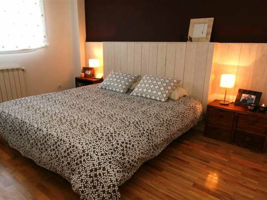 Escaleras arriba, nuestros pasos nos llevan hasta el dormitorio. Un zócalo de listones a modo de cabecero, las mesillas y puertas de los armarios nos recuerdan que Isabel sabe manejarse perfectamente con la carpintería. Esta alcoba destila un romanticismo muy sereno.