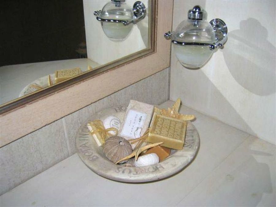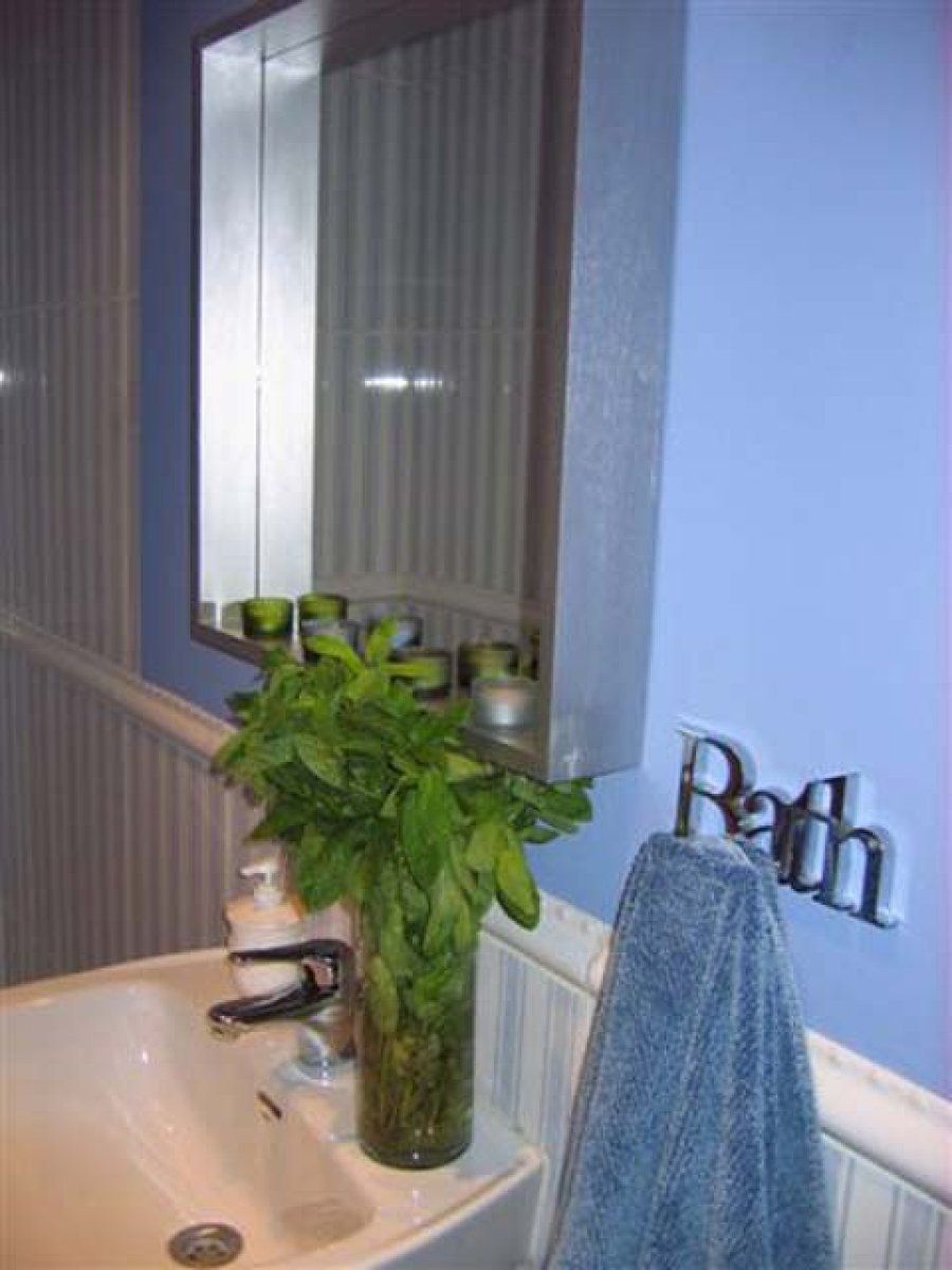 El aseo de la parte de abajo es algo más desenfadado. Al jugar con el azul y el plateado del espejo, retocado por Isabel, la estancia gana en alegría. Las dimensiones de los azulejos cerámicos permiten engañar a nuestro ojo haciéndonos pensar que estamos delante de un bonito papel pintado de rayas.