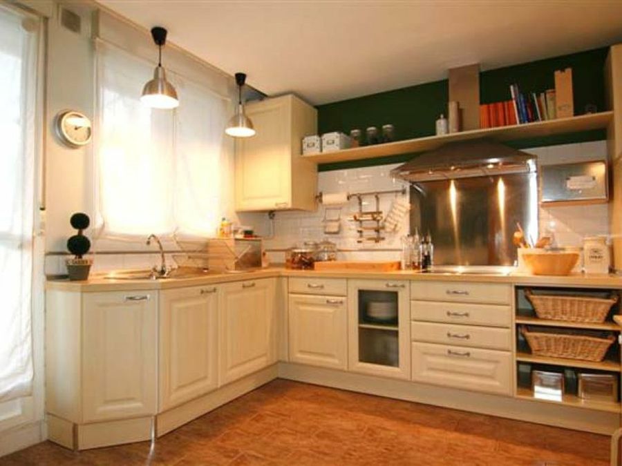 La cocina es el sueño de cualquier adicto al estilo provenzal. Tonalidades cremosas, que van del beige al tostado se reparten por los muebles, encimera, frente y accesorios. La mesa del office, debajo del pavés, ha sido reinventada por esta forera dándole un nuevo color y cambiando los tiradores.