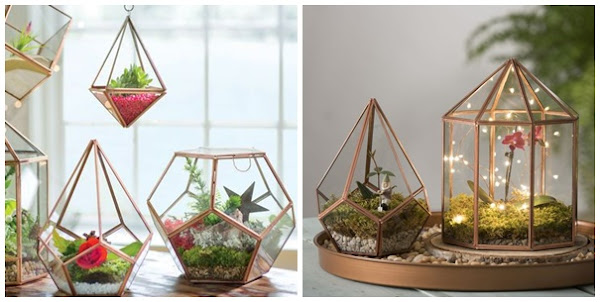 Son unas cajitas o bolitas de cristal, con forma, los hay de muchos tipos, en forma de diamante, redondos, cuadrados. Y dentro se plantan suculentas ¿No sabes lo que son suculentas? Pues una planta perfecta para las que no nos acordamos de regar jijiji, son plantas que van engrosando para almacenar agua y permiten aguantar largos periodos sin agua. Los cactus son los más conocidos pero hay muchísima variedad. Con solo estos dos materiales conseguimos un terrario, genial para poder colgarlo, o dejarlo simplemente como objeto decorativo sobre la mesa del recibidor o en cualquier rincón que necesite vida.