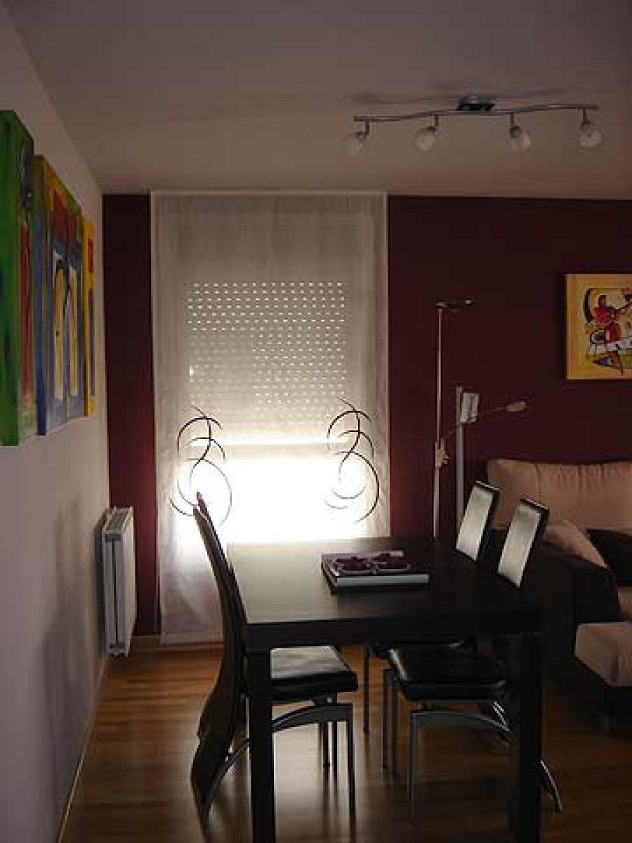 Calidez sin excesos. Ese fue el objetivo cromático que debían cumplir las paredes del salón. Un arrebatador granate inunda las correspondientes al sofá y al ventanal, vestido con estores adornados con motivos que sirven de nexo de unión. Por su parte, el conjunto de comedor obedece a los niveles de calidad que perseguían.