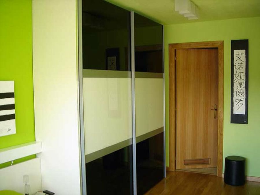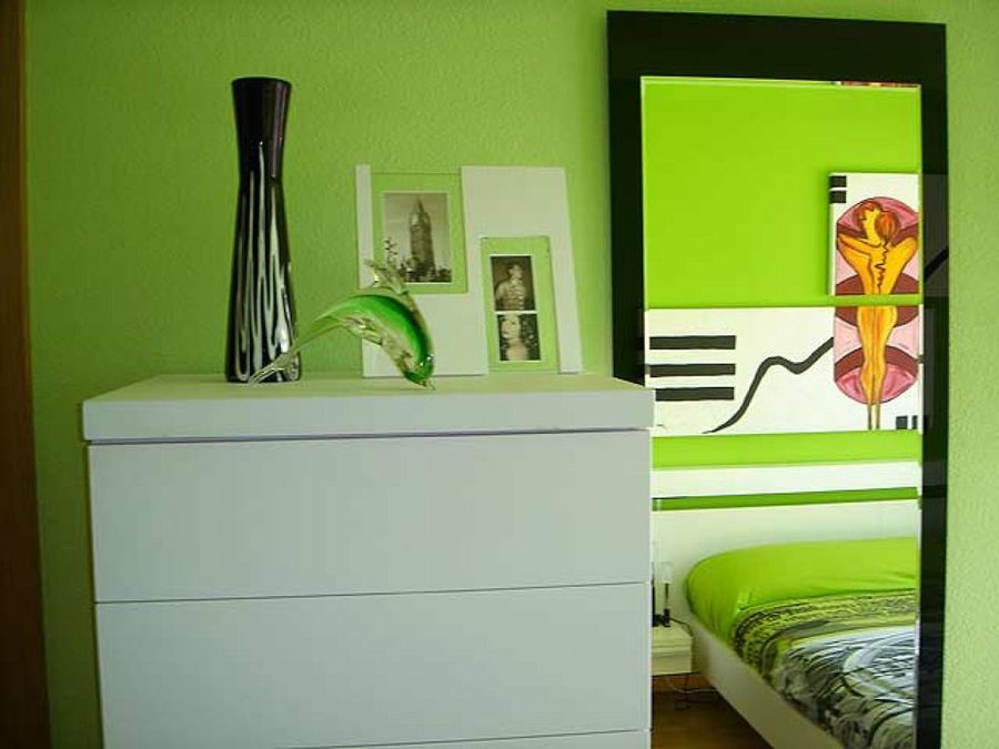 Una vez llegados a la estancia más íntima de la casa, el dormitorio principal, Ainhoa nos confiesa que fue el armario el elemento del que partió la inspiración. El contraste entre el blanco y el negro de sus paneles obligó a introducir un aire rompedor y arriesgado en el patrón tonal. El verde acabó fascinando a ambos.