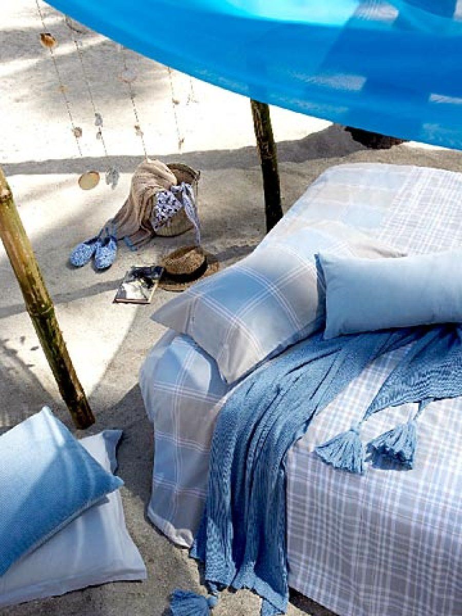 Al poner la mesa, también se pueden experimentar los matices cromáticos más característicos de las aguas que nos refrescarán en verano. Además, Textura también pone a tu disposición cojines en estos tonos delicados. Por su parte, Destiny&Design añade un plus de viveza y acidez a los cojines de estos colores, porque el estío es sinónimo de alegría.En Textura son expertos en transformar los colores en sensaciones placenteras, por eso no dudan en presentarte una colección de tonos donde la naturaleza y la frescura caminan de la mano. Los suaves cuadros, rayas y flores azules de su ropa de cama parecerán mecer tu sueño al ritmo del relajante y sugerente oleaje del mar.