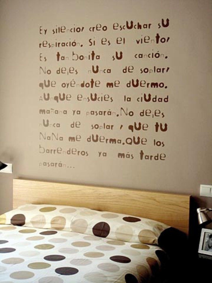 Los vinilos triunfan esta temporada. Eva (Meencantamicasa) también era partidaria de ellos: "me gustaba la idea de un vinilo o algún papel personalizado, pero no acababa de convencerme ninguno". De repente, le vino a la mente la letra de una canción. Tuvo el material en sus manos a los dos días de encargarlo en la copistería. Para colocarlo, se ayudó de "cinta de carrocero y un nivel".