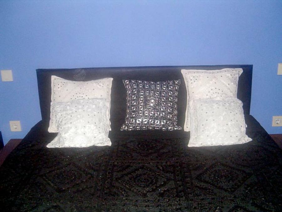 El principal problema de Izaskun (Izasberri) era el pilar en la pared del cabezal: "se me ocurrió que podíamos aprovecharlo e integrarlo un poco". Tras hojear algunas revistas, se puso manos a la obra valiéndose de materiales baratos y accesibles como "un tablero de DM, clavos, cola, martillo, lija de grano fino, pintura, rodillo...". Únicamente lamenta no haber hecho una tapa practicable.Wgranca se llama en realidad Mapi, y es una de las muchas participantes del foro que decidió fabricar un cabecero de piel: "decidí que quería un cabecero de ese estilo, pero eran un poco caros y estaba esperando para ver cuando podía comprar uno... hasta que una forera puso cómo se hizo el suyo en polipiel blanco". Un panel de 75 x 160, gomaespuma y una grapadora hicieron el resto.
