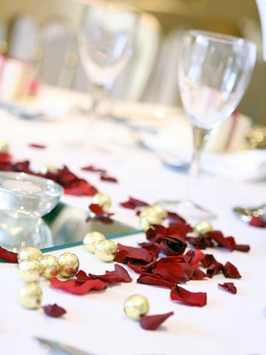 Si vas a esperar a la noche para disfrutar de una cena en la intimidad de tu hogar, quizá quieras añadir algún adorno que, sin llegar a ser exagerado, aporte un matiz diferente. Una vajilla en tonos rojos, unas velas, una rosa encima del plato, unas pegatinas diseminadas por el mantel, algún ornamento dorado, unos pétalos de rosa...