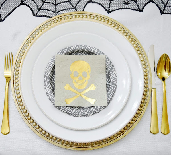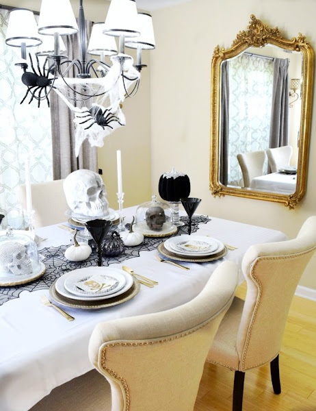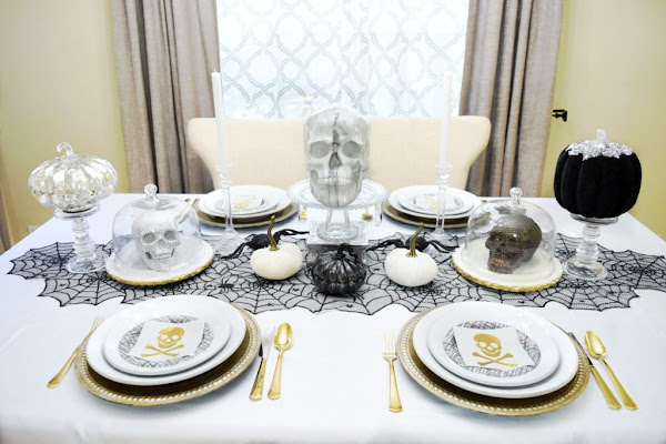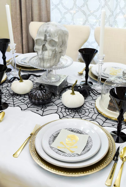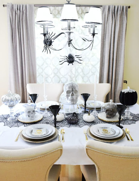 Por el título puedes pensar que te voy a enseñar una típica mesa decorada para Halloween, con los colores negro y el naranja como protagonista. Pues no es así, bueno te he dejado una pista, la foto de arriba me delata jeje. Es una preciosa mesa, elegante y chic, pero a la vez escalofriante... Con el negro, blanco y metales como el dorado y el plata.