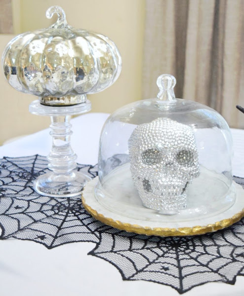 Bueno te cuento un poco sin enrollarme mucho, la mesa esta vestida por un mantel blanco y un camino de mesa en forma de tela de araña de color negro. Ahora vamos por la descripción de los objetos, la mesa terrorífica está presidida por una carabela de mármol que la sostiene un pedestal de cristal, y unos portavelas de cristal; a los lados hay una calavera en plata y otra en bronce (te cuento un secreto, la de bronce no es una figura, es una ...vela, si si a que no lo parece) estás puestas en unos platos y tapadas con unas campanas de cristal. En el centro también se encuentran unas calabazas típicas de estas fechas combinando siempre el color blanco, dorado y el negro, además tienen dos compañeras, unas arañas, que también están arriba en la lámpara. En cada punta hay unos portavelas que sostienen una calabaza a cada lado de distinto color, una de cristal que me parece preciosa y otra negra y plata.