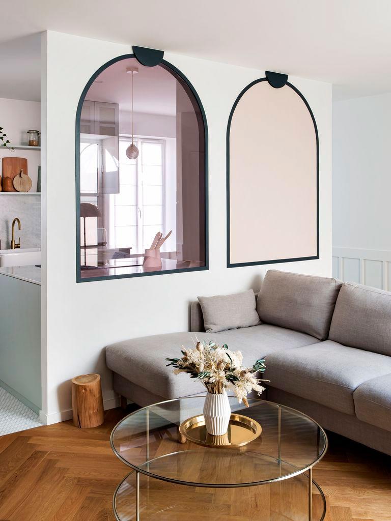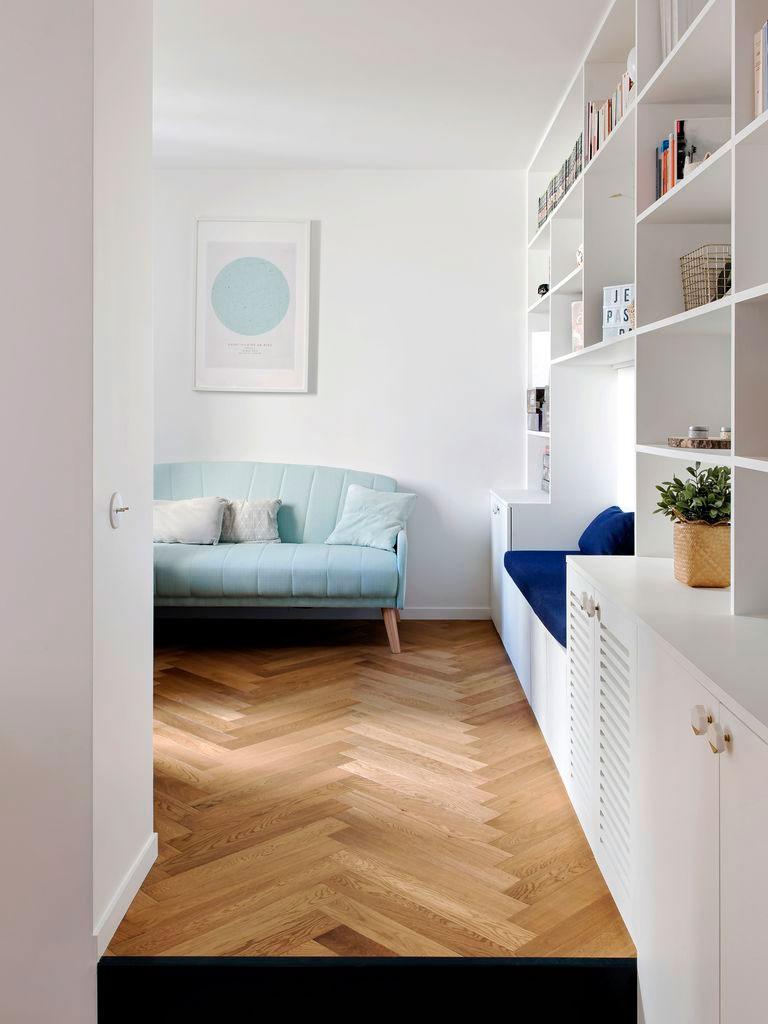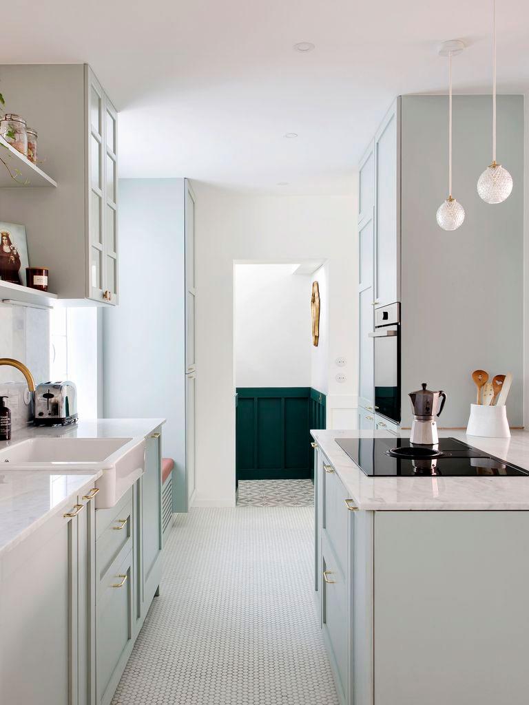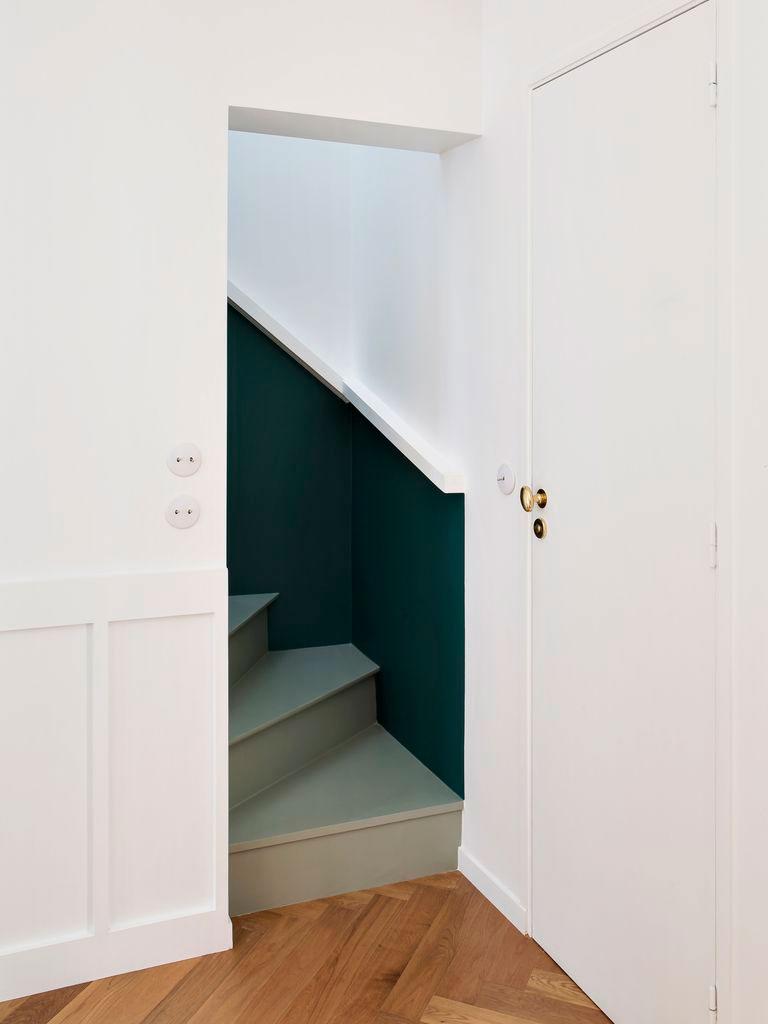 Zócalos a media altura y un verde intenso recorren parte de la vivienda, decorando sí, pero cuando los espacio son largos y estrechos, mediante esta técnica conseguimos disminuir la sensación de tubo en pasillos largos como en este caso, o en entradas pequeñas (como la de esta vivienda también), generando interés en esa pequeña estancia. Aquí, podemos ver cómo en la entrada se ha colocado sencillamente un espejo, el zócalo pintado y un suelo hidráulico que enmarca el espacio diferenciándolo del resto.