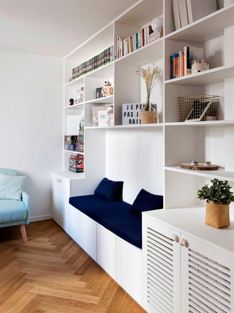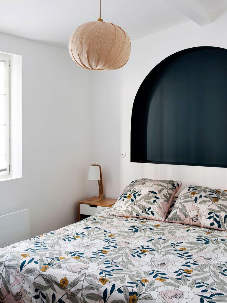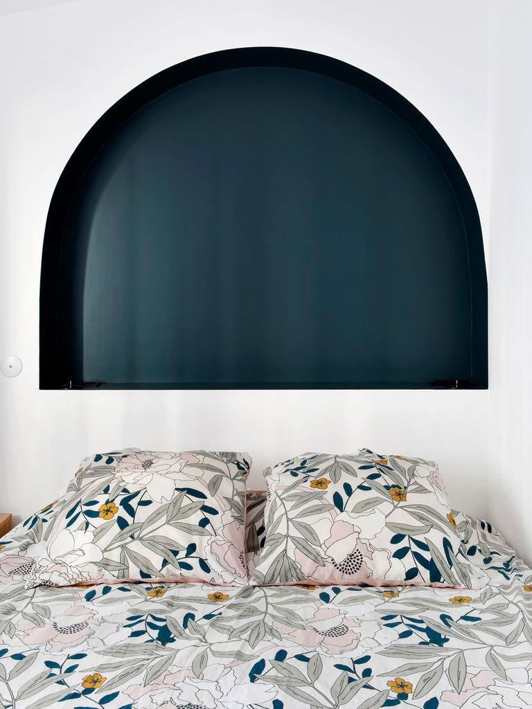 Las formas curvas están también presentes en todas las estancias, desde el salón donde se realizaron ventanales acabados en arco que lo comunican con la cocina, a los propios muebles como los del office, o la mesita redonda frente al sofá, las mismas curvas de la escalera, y más claramente al llegar al dormitorio principal donde sobre la cama, se ha construido una hornacina a modo de cabecero y se ha pintado de un azul intenso para resaltar. Finalmente el baño principal, también cuenta con sinuosas formas curvas, pero aquí ya estamos ante otro cantar.