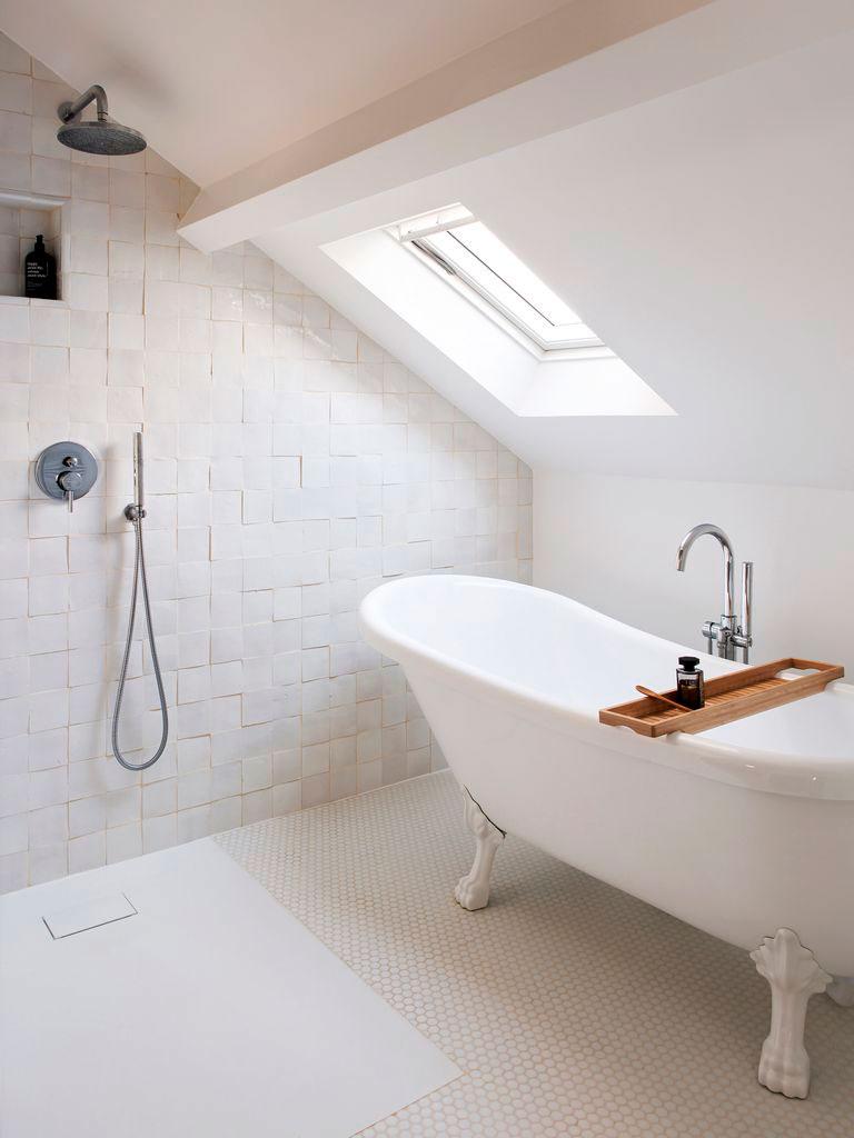 Junto con la cocina, mi espacio favorito de la casa, ha sido amor a primera vista. La bañera vintage con patas es la protagonista y queda especialmente bien con esos azulejos tipo rústicos de 10*10 de la pared. Para el suelo se ha elegido los mismos de la cocina, de tipo mosaico. El hecho de que el baño esté abuhardillado y que en la parte del lavabo se hayan incorporado toques dorados, fibras naturales y colores más cálidos, lo hace todavía más confortable.