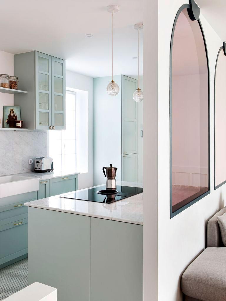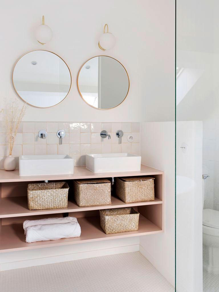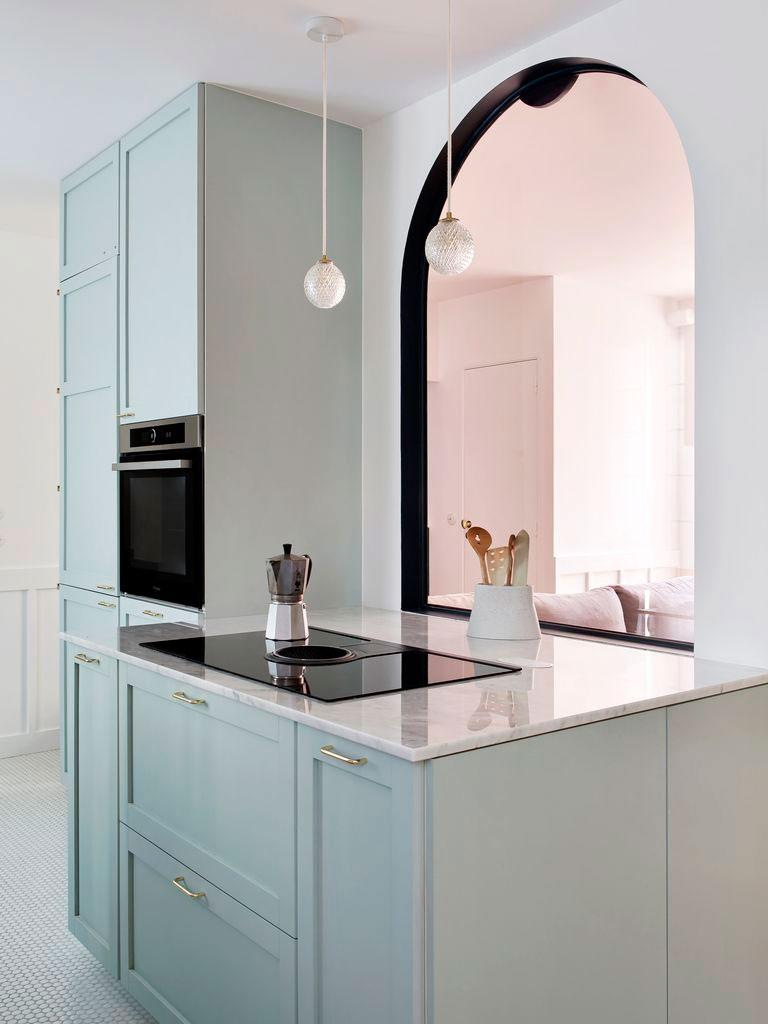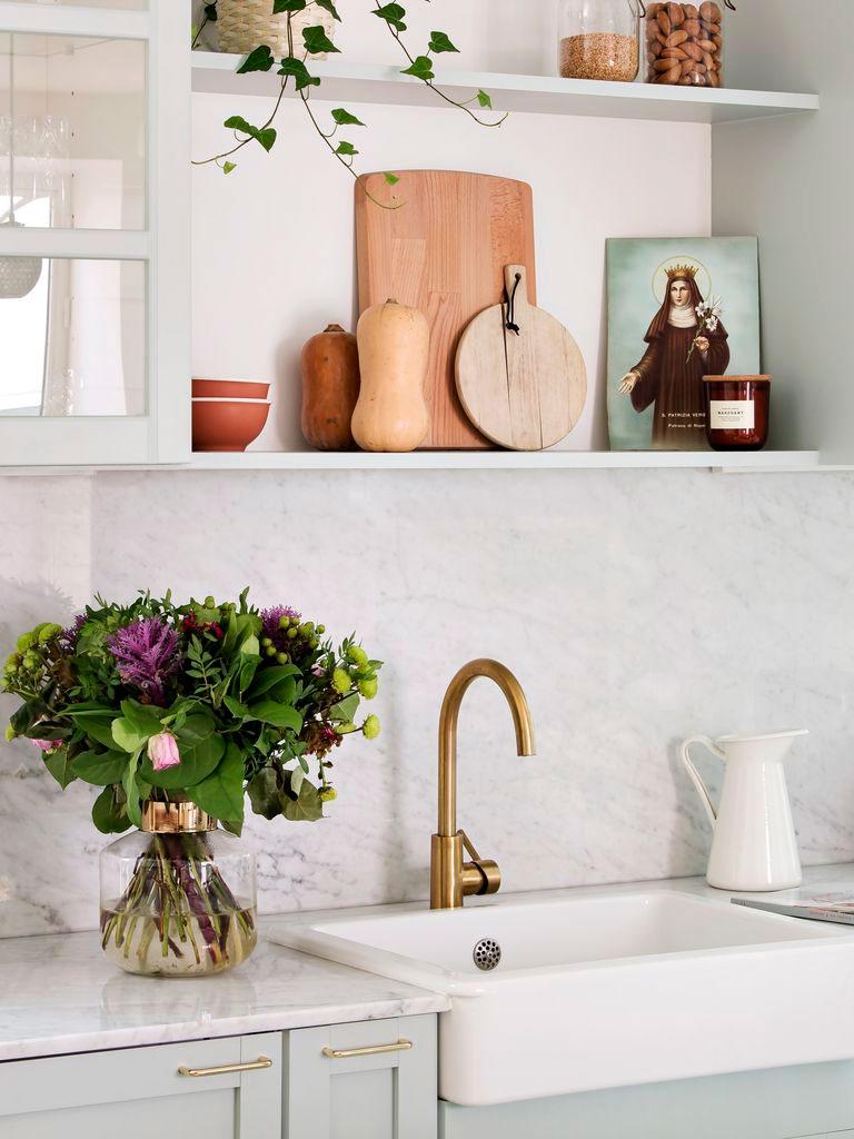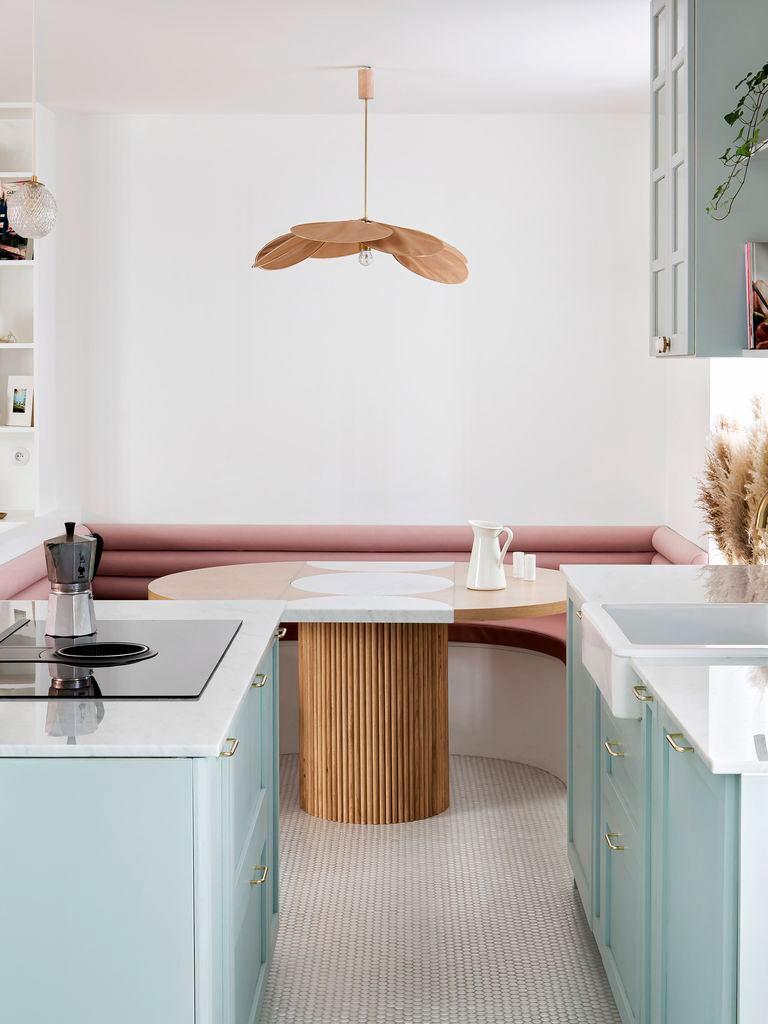 La casa está llena de detalles para comentar. Preciosa la cocina donde predominan los colores pastel, el azul grisáceo de los muebles combinado con encimeras de mármol y pequeños toques dorados (como en la grifería o los tiradores), acompañan al suelo de mosaico, que completa el conjunto. Los guiños de madera (como las tablas de cortar o los utensilios de cocina), tienen su réplica en el office, sin duda uno de los espacios más originales de toda la casa. Está inspirado en los clásicos dinners americanos con estética de los 50´. Un gran banco en forma de U de terciopelo rosa, acoge la mesa redonda que combina madera y mármol en su base dibujando formas geométricas. Remata el conjunto, una lámpara con forma de pétalo que ilumina el comedor.