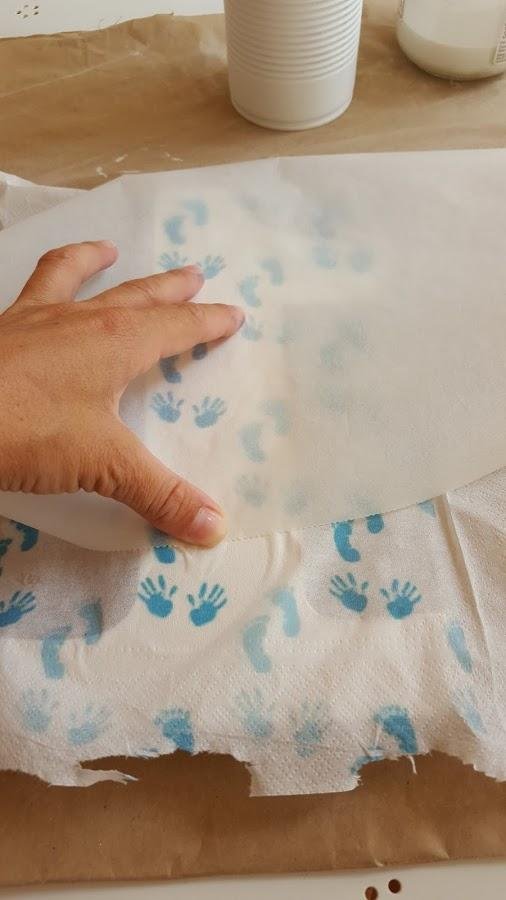 Una vez seca la mezcla, colocamos la servilleta que hayamos elegido (sólo debemos poner la capa superior de la servilleta que lleve el dibujo, las otras capas debemos retirarlas), sobre la madera: