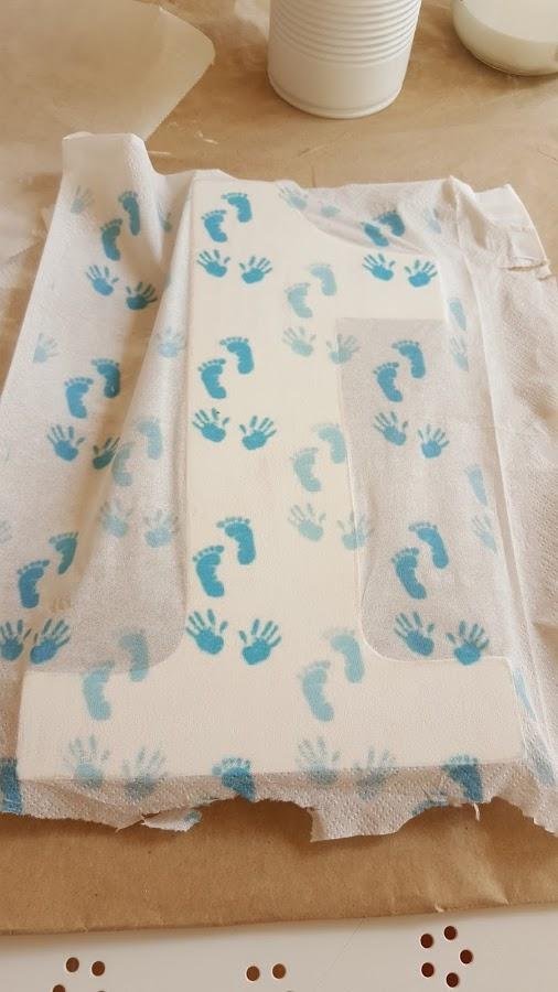 Una vez terminado el número y un día antes del cumpleaños, mi cuñada trajo todas las cositas para decorar la fiesta y entre esas cositas había unas servilletas muy cuquis de rayitas blancas y azules que me encantaron, así que no me pude resistir a cambiar la decoración del número y realizar el decoupage con las servilletas de rayitas: