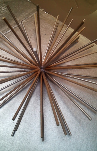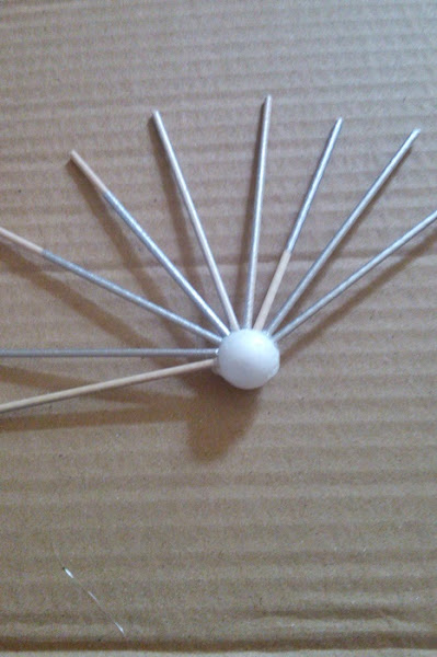 Siempre se empieza a colocar por la mitad de la bola hacia un lado. Yo iba echando una tira de silicona y colocaba dos palitos y así haciendo toda la mitad de la esfera. Hay que tener un poco de paciencia ya que la silicona al estar tan caliente no agarra los palos en dos segundos.