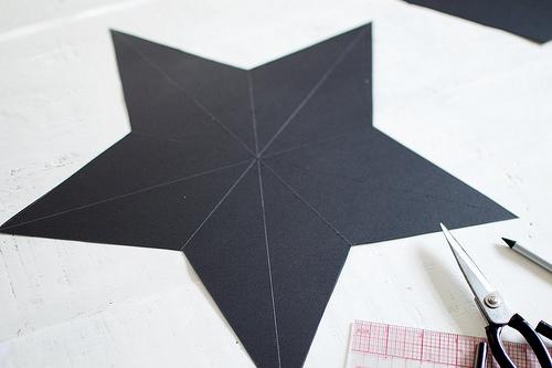 Corta la estrella que has dibujado en la cartulina. Ahora marcamos los pliegues por donde doblaremos nuestra estrella. Para eso coloca la regla desde cada punta de la estrella a los puntos medios como se ve en la foto. Desliza un lado de la tijera abierta, marcando pero no cortando!