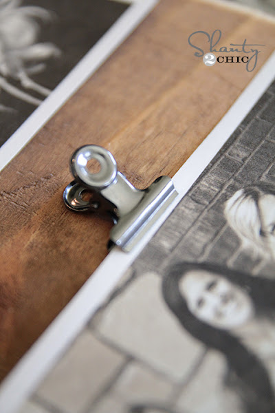 Cuando tengamos fijada la lámina, con la cola adhesiva fijaremos las pinzas de papel, una arriba y otra abajo y cuando estén secas engancharemos las fotos que hayamos escogido.