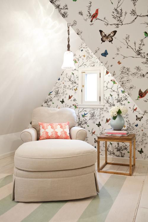 Enamoramiento, del día, de la semana y del mes jijiji Me encanta este dormitorio, trasmite muchísima paz, el papel de pared con pajaritos y mariposas colocado en el techo abuardillado no me puede gustarmás, la combinación de colores, el material del cabecero..... crean un espacio super natural que lo hacen muy muy acogedor. A mi juicio la habitación perfecta,no os parece?