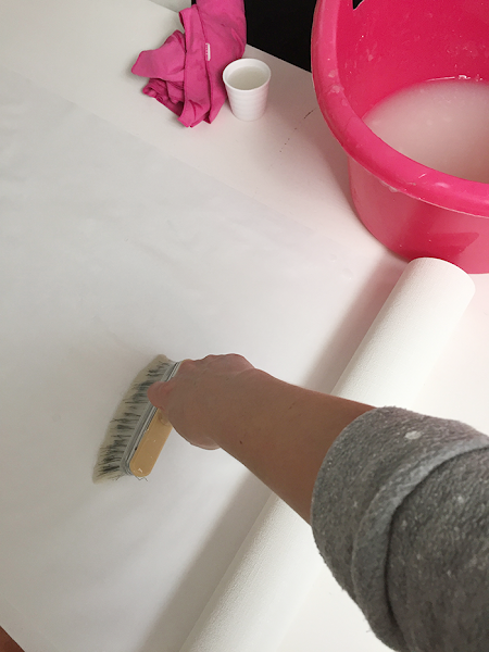 El sábado el suelo ya estaba puesto en el dormitorio, así que yo me puse a cortar el papel y a empapelar.