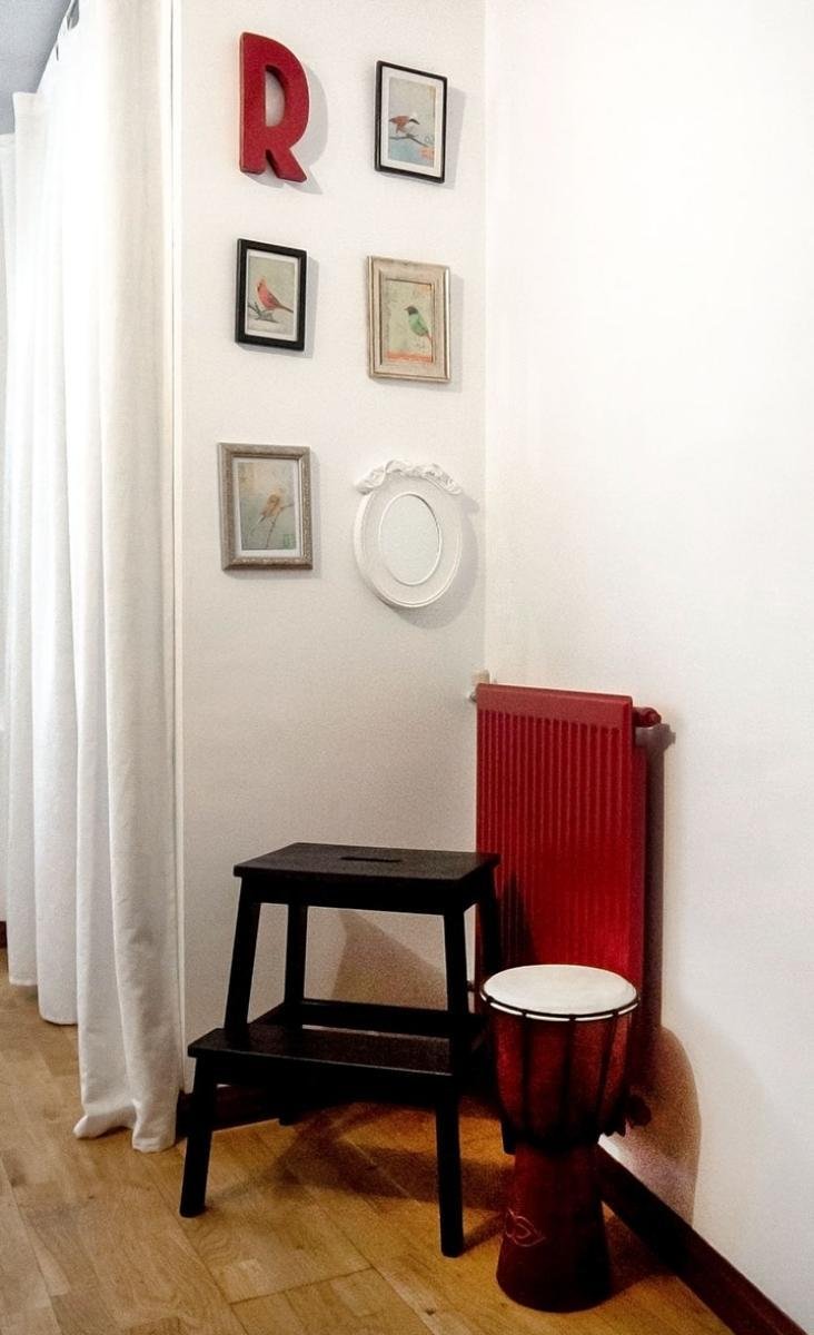 Por último, al tener tan poco espacio se opto por no poner más muebles. Sólo un taburete con una composición de láminas, unas cortinas blancas a modo de puerta de armario y, atención, porque el radiador también se ha optado por pintar y no nos puede gustar más el resultado.