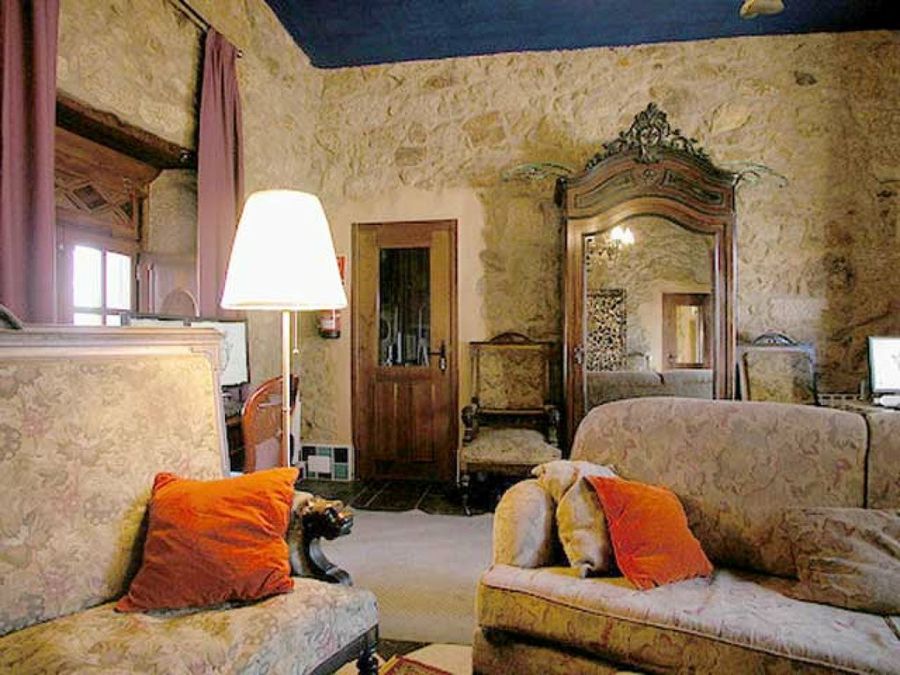Una vez dentro de la casa, las zonas comunes están presididas por grandes sillones y butacones de estampados florales y telas con mucha presencia, como el terciopelo. Las paredes de piedra conviven con muebles de diseño barroco como el armario con motivos dorados, que dan un toque muy especial a toda la decoración. En lo referente a los detalles se busca la simplicidad para crear ambientes amplios y relajantes.