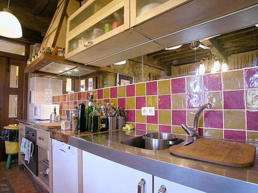 El diseño de la cocina no puede dejarnos indiferentes. El estilo rústico en los fogones se mezcla con azulejos en tonos morados y fucsias que llenan de color esta estancia. Los muebles en madera oscura con líneas muy sencillas son una mezcla perfecta. La zona del comedor está coronada con una lámpara de techo colgante que atrapa todas las miradas de los recién llegados.