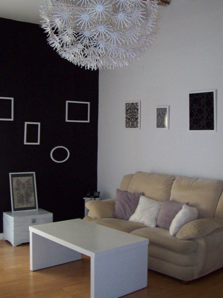 El salón continúa con los contrastes de blanco y negro, con detalles personales como la butaca o la imponente lámpara de la colección PS de IKEA. La madera del suelo y las vigas potencian la sensación de calidez y la pared de ladrillo blanco nos recuerda a los loft neuyorquinos.