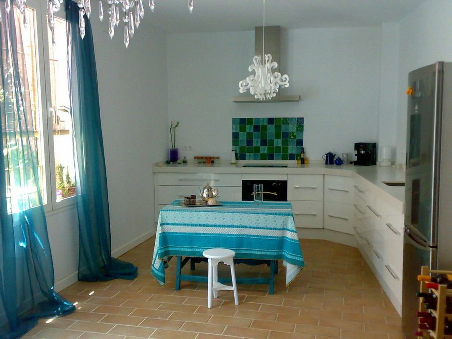 La cocina es uno de los espacios más amplios de la vivienda. Cuenta con dos zonas muy diferenciadas como son el comedor y la zona de cocción y aguas. Destacar en esta segunda parte el uso de azulejos sólo en el espacio de la vitrocerámica. Otro toque diferenciador de la cocina es el uso de lámparas de inspiración barroca y el azul que aporta mucha alegría.