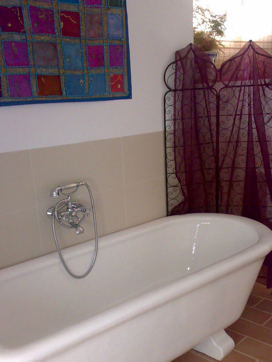 Uno de los baños tiene una estética muy minimalista, contando sólo con un mueble de reducidas dimensiones y un plato de ducha con el suelo en madera. Para los revestimientos se ha continuado con las paredes blancas y los suelos en madera. En otro destaca una gran bañera y un biombo de estilo árabe.